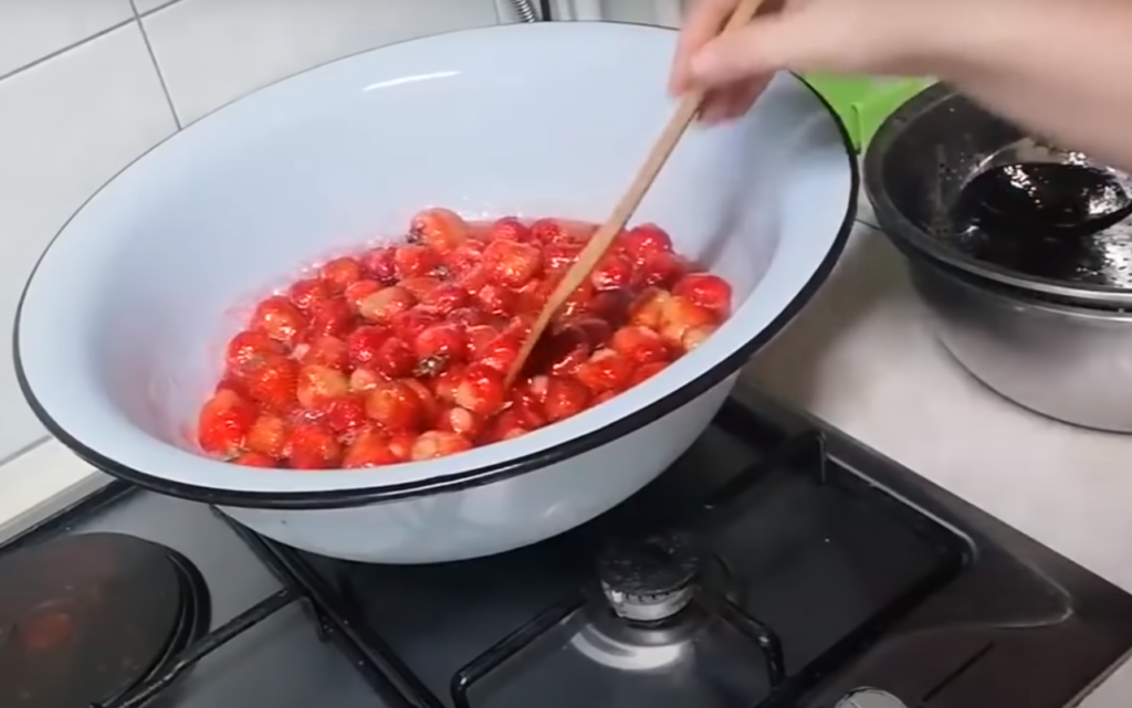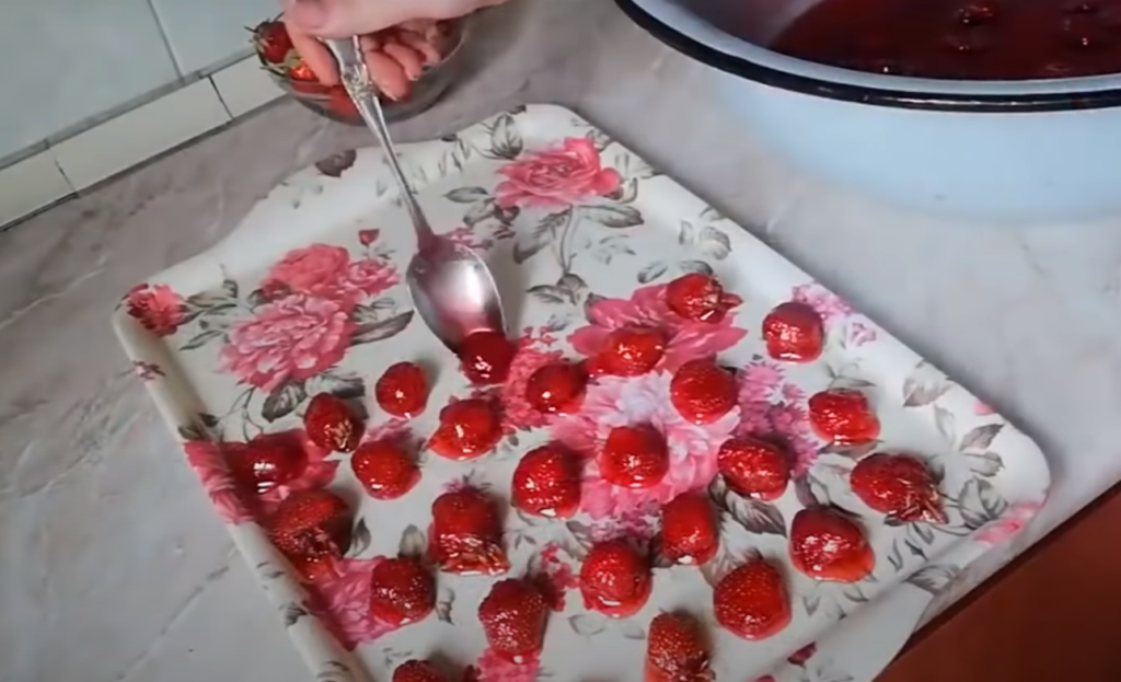 Krok z przecedzaniem syropu i gotowaniem powtarzamy, ale tym razem gotujemy syrop dłużej, aż uzyska konsystencję lekkiego dżemu. Zalane truskawki doprowadzamy do wrzenia, gotujemy tylko minutę, po czym natychmiast wyłączamy ogień. Oczekujemy, aż ostygną, a następnie wykładamy truskawki na tacę, rozmieszczając je pojedynczo.