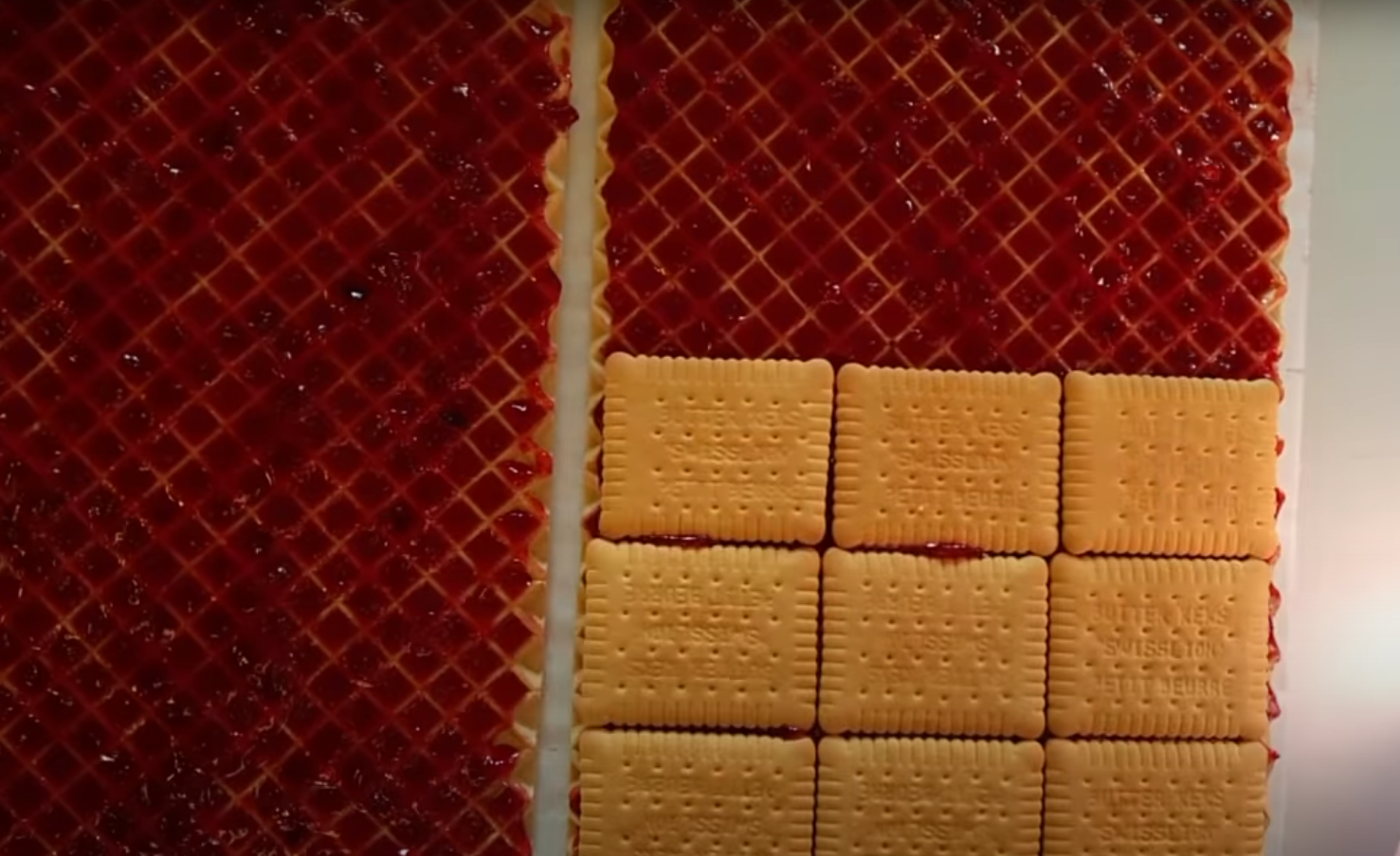 Na dwa duże wafle rozprowadź dżem oraz na jednym z nich poukładaj herbatniki. Do garnka wlej przygotowaną wodę i wsyp cukier. Całość gotuj i mieszaj do momentu, aż cukier się rozpuści.