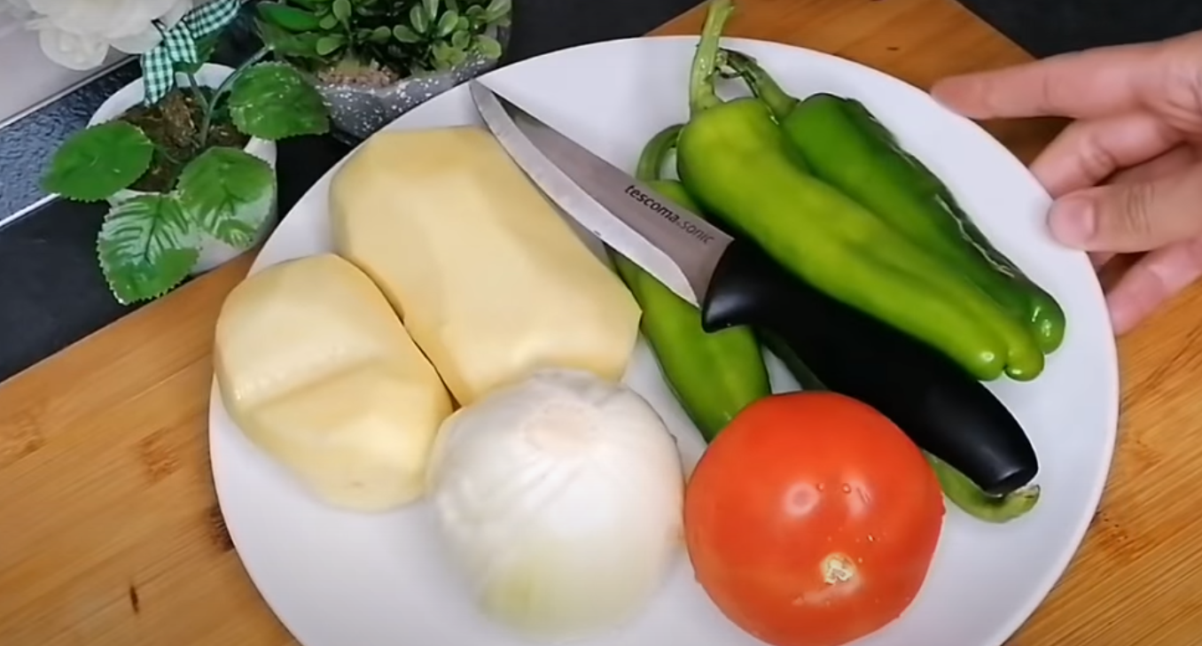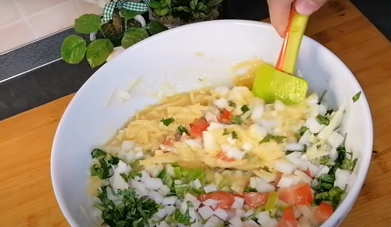 W pierwszej kolejności ziemniaki należy obrać ze skórki, a następnie na tarce o grubych oczkach zetrzeć i mocno odcisnąć z soku. W kolejnym kroku pomidory, cebulę i paprykę trzeba umyć i pokroić na drobne kawałki.