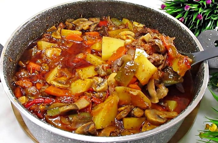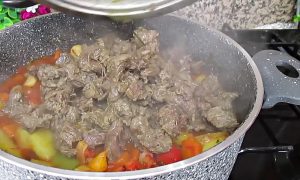 Na koniec dodaj mięso, które zostało ugotowane i pokrojone na małe kawałki, zalej litrem wody, wymieszaj i pozwól, aby wszystko razem się zagotowało. Kiedy warzywa całkowicie zmiękną, pomidory się rozpadną, a sos lekko zgęstnieje, gotowe. Po ugotowaniu pozostaw garnek na kolejne 10 minut, aby smaki składników się połączyły i możesz podawać.