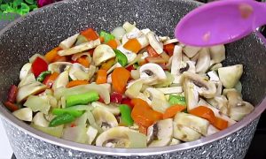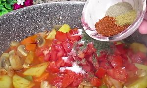 Po ponownym wymieszaniu zamknij pokrywkę i jeszcze chwilę gotuj warzywa. Następnie dodaj ziemniaki i ponownie gotuj na wolnym ogniu pod pokrywką. Nie dodawać wody do mieszanki, tylko poczekać, aż warzywa puszczą soki.