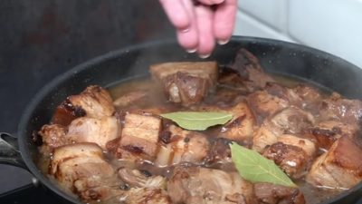Następnie dodaj do mięsa sos sojowy i sos ostrygowy i pozwól, aby płyn się zredukował przez kilka minut na średnim ogniu. Dodaj liście laurowe, trochę więcej pieprzu i tyle gorącej wody, aby mięso wypłynęło. Gotuj wszystko pod pokrywką, aż mięso będzie miękkie.