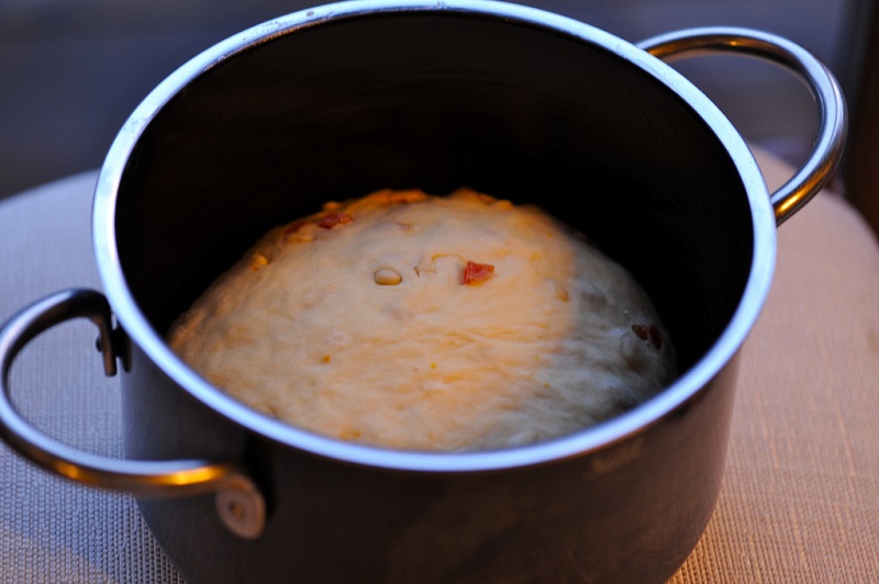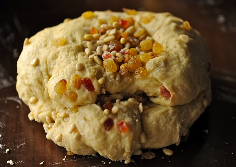 Wyrobić ciasto. Ciasto powinno być elastyczne jak guma do żucia. Dodaj orzechy, owoce kandyzowane i sułtanki. Wszystko połączyć. Wymieszaj wszystkie składniki. Krótko zagnieść ciasto. Pozostawić ciasto w ciepłym miejscu na ok. 1,5 godziny. Do tego czasu ciasto powinno podwoić swoją objętość.