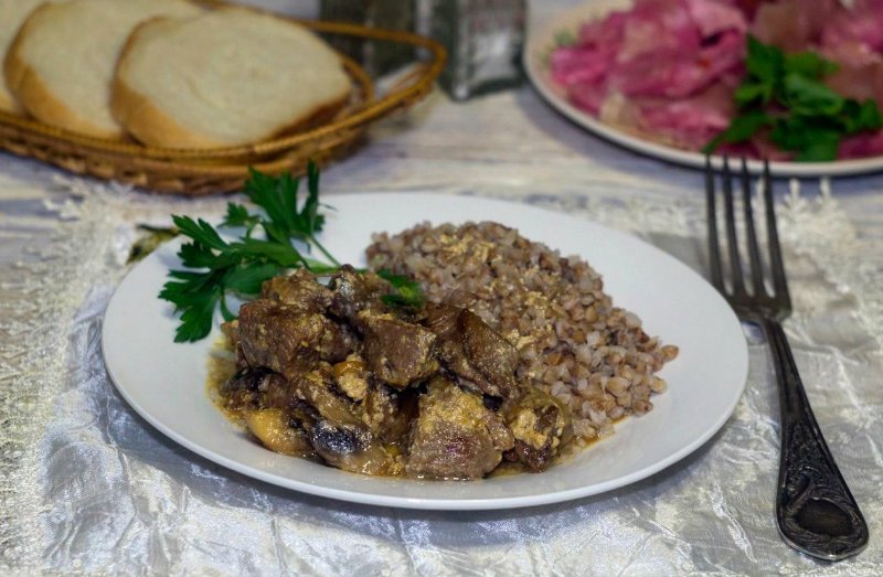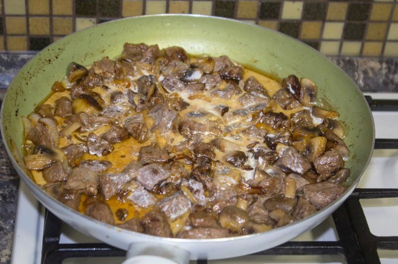 Gdy mięso zmięknie, dolewamy mleko i jogurt i solimy do smaku. Podgotowujemy jeszcze przez kilka minut. Tak uduszone mięso świetnie sprawdzi się z dodatkiem ziemniaków lub kaszy podczas rodzinnego obiadu. Warto również poeksperymentować nieco z sosem i zamienić pieczarki na inne, ulubione grzyby.