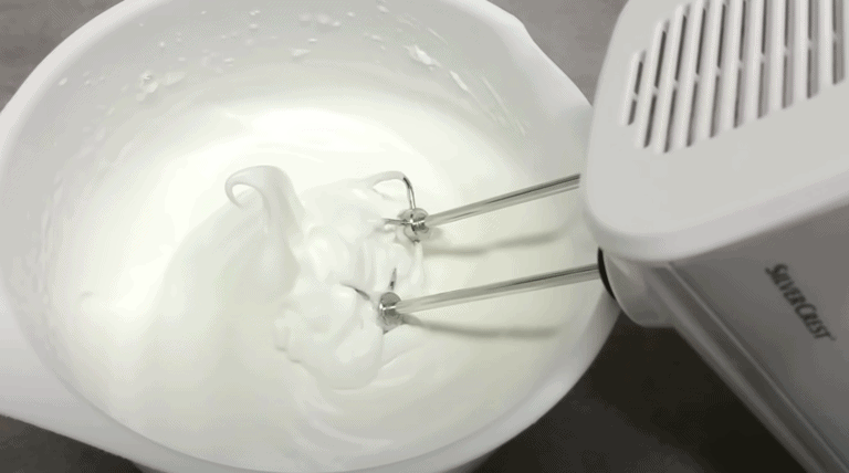 Następnie dodaj do tego ubite białko, dzieląc je na 3 części. Pierwszą część ubijaj klasycznie, z kolei dwie pozostałe części cały czas mieszaj. Dodaj ją do powstałej mieszanki, łącząc całość za pomocą delikatnego mieszania na obwodzie.