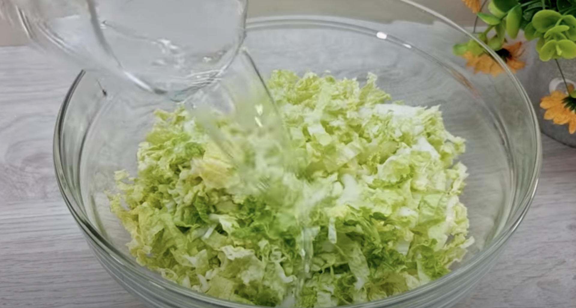 Kapustę pekińską drobno posiekaj i włóż do miski. Wlej 400 ml wrzącej wody i dokładnie wymieszaj kapustę. Odstaw na razie na bok.