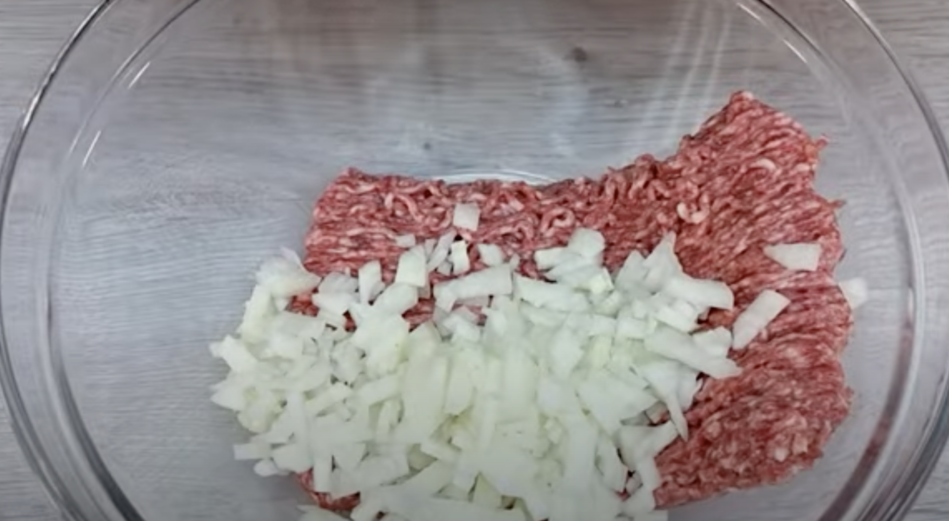 Cebulę pokrój w drobną kostkę oraz wymieszaj z 500 gram mielonego mięsa.