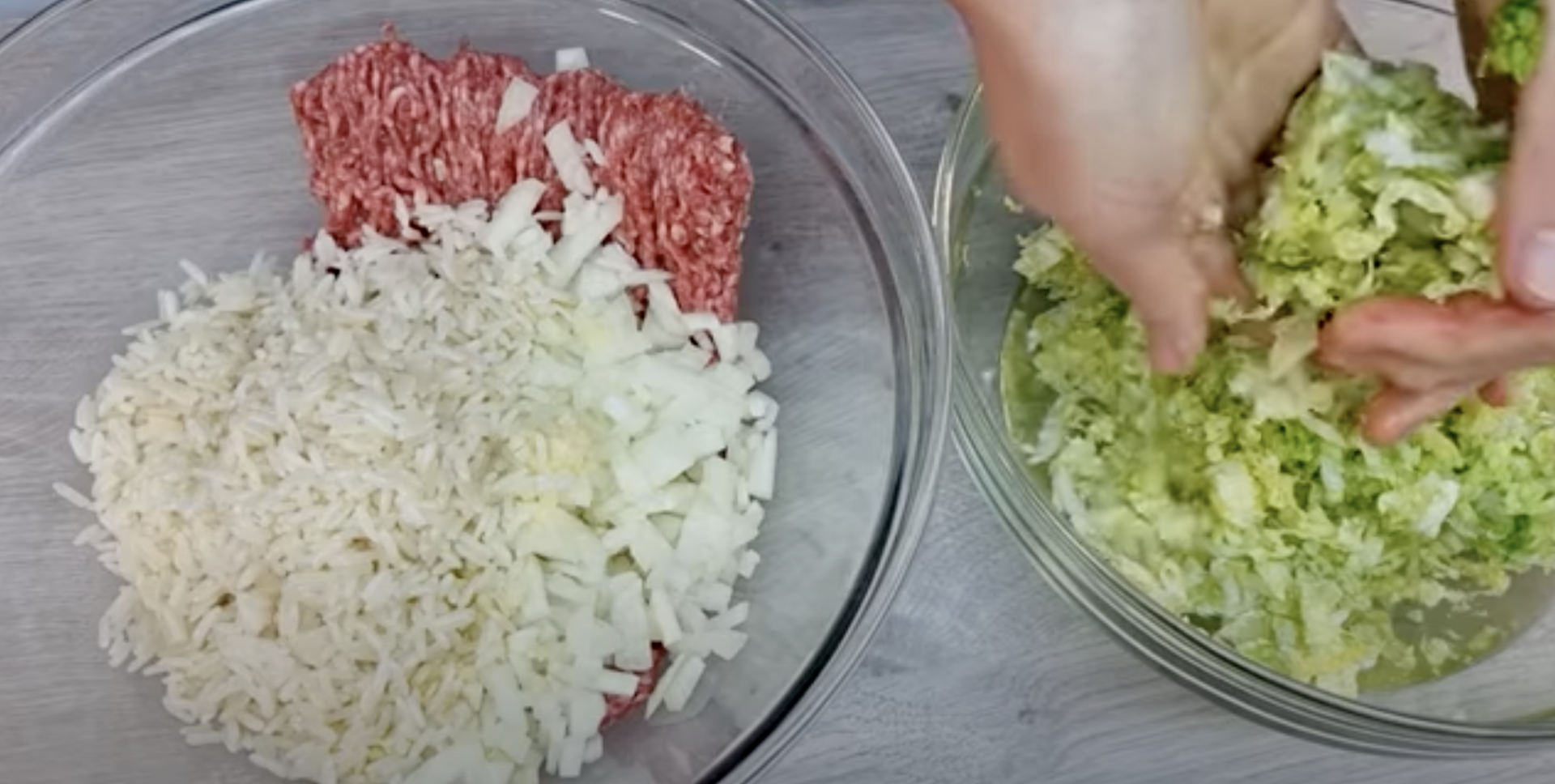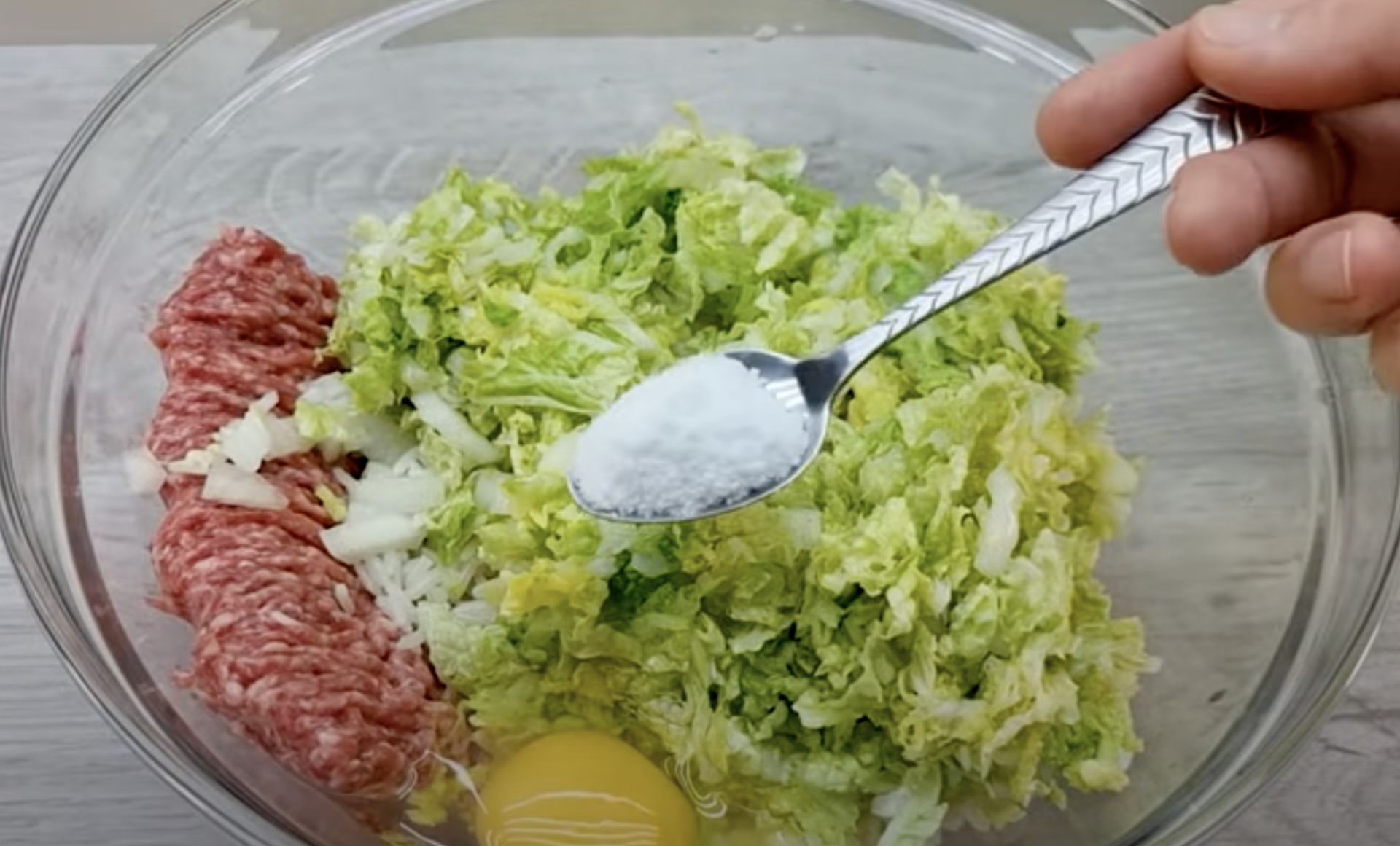 Do mięsa dodaj odciśnięta z wody kapustę pekińską. Przypraw do smaku ulubionymi przyprawami oraz 1 łyżeczką soli.