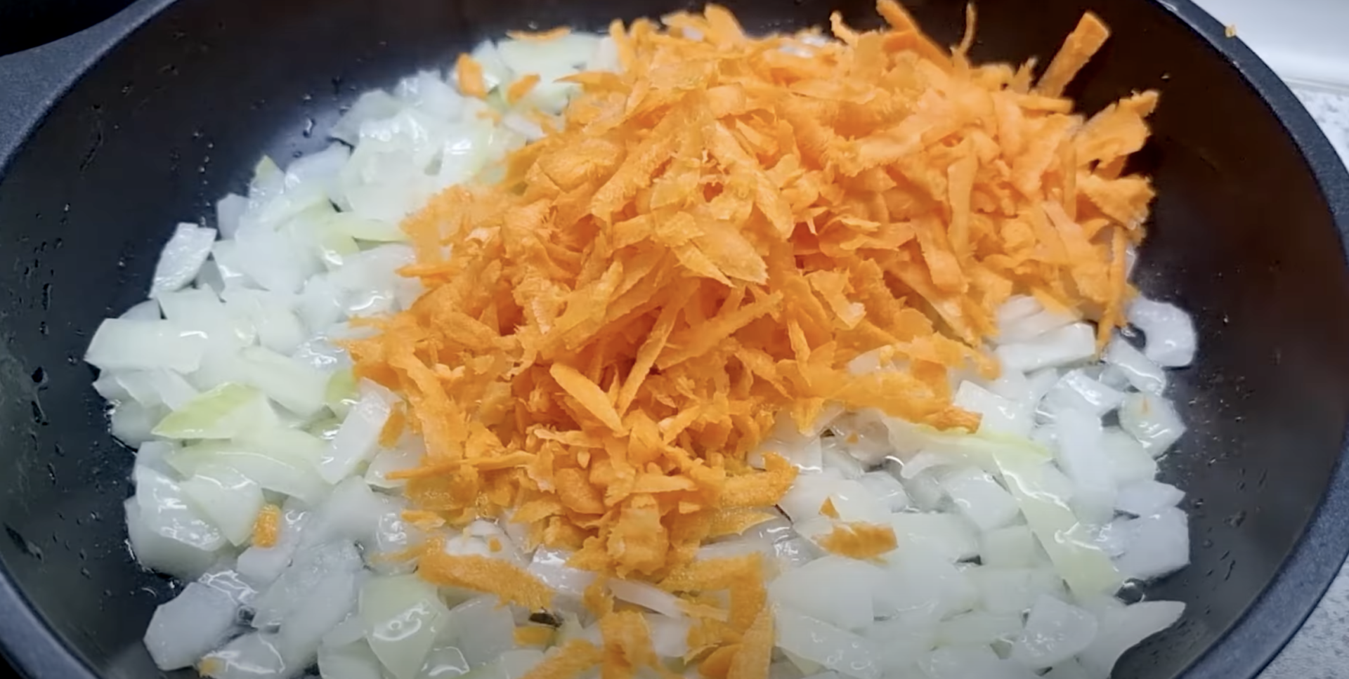 Na rozgrzanej patelni z olejem podsmaż cebulę na złoty kolor. Dodaj startą marchewkę i smaż przez 5 minut.