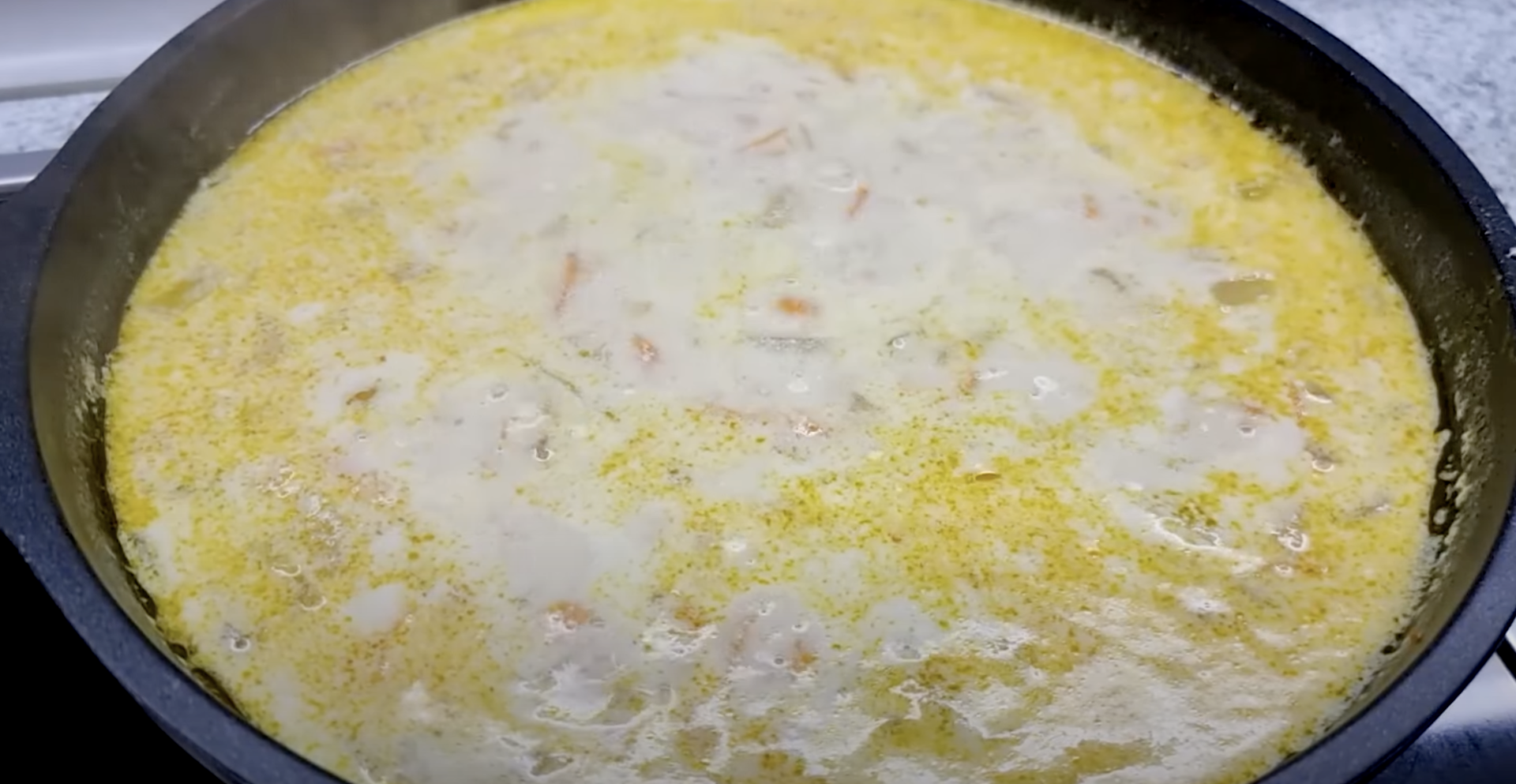 Następnie dodaj przeciśnięte przez praskę dwa ząbki czosnku, 500 ml wody i 200 gram kwaśnej śmietany. Doprowadź do wrzenia oraz duś na wolnym ogniu pod przykryciem.