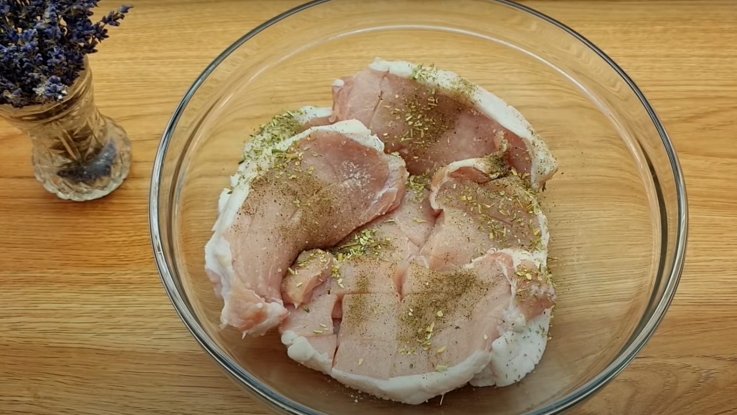 Plastry mięsa przekrój z obu stron na kształt kratki. Włóż schab do miski, posól z obu stron, popieprz i posyp oregano.