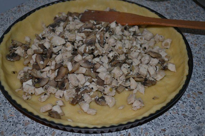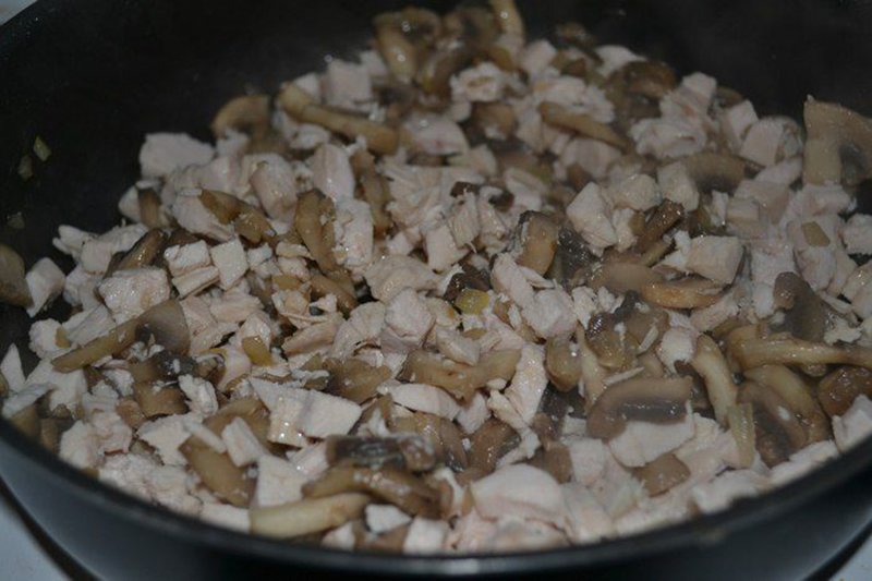 Ugotuj pierś z kurczaka. Pieczarki i cebulę posiekaj i podsmaż na patelni. Ugotowanego kurczaka pokrój w kostkę i dodaj do cebuli i pieczarek. Wszystkie składniki podsmażaj jeszcze około 5 do 7 minut.