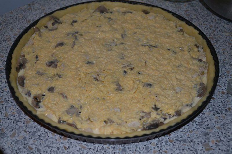 Następnie wyłóż przygotowane nadzienie i zalej je zalewą z sera i jajek. Zapiekankę piecz w piekarniku przez 30 do 40 minut.