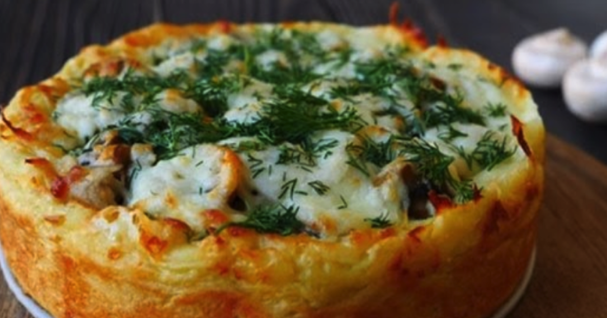 W tym wgłębieniu ułóż gotowe mięso i lekko dociśnij. Posól podsmażone grzyby i wyłóż je na mięso. Przykryj ciasto folią i włóż do pieczenia: 20 minut w 180 stopniach.