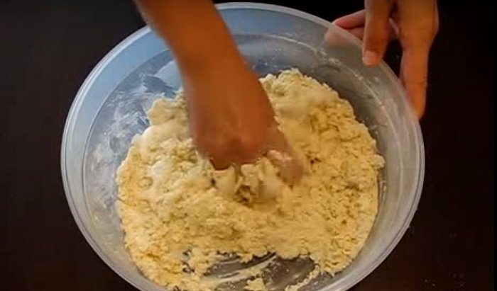 Przesianą przez sito mąkę wsyp do miski, dodaj sól i cukier i całość wymieszaj. Do osobnej miski włóż miękką margarynę (lub masło), wsyp zawartość pierwszej miski oraz dodaj śmietanę, która powinna być w temperaturze pokojowej. Wszytko razem wymieszaj oraz dodaj zawartość z kubka. Z całości ugnieć ciasto.