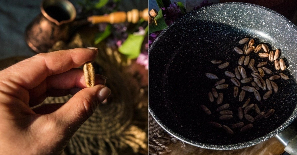 Po wysuszeniu, nasiona należy przesypać na suchą patelnię i smażyć do momentu, aż nabiorą lekko złotego koloru. Ważne, by nie doprowadzić do ich przypalenia. Ich gotowość łatwo jest rozpoznać po kruchości.