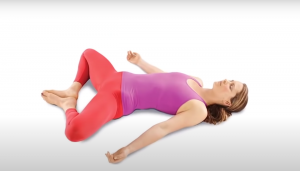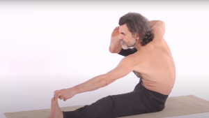 Siedząc na podłodze z wyciągniętymi nogami do przodu, chwyć kciuki i przyciągnij swoją lewą nogę do lewego ucha. Następnie wyciągnij łokieć za ucho, a prawą nogę staraj się utrzymywać cały czas na podłodze. W takiej pozycji należy pozostawać przez około 20-30 sekund.