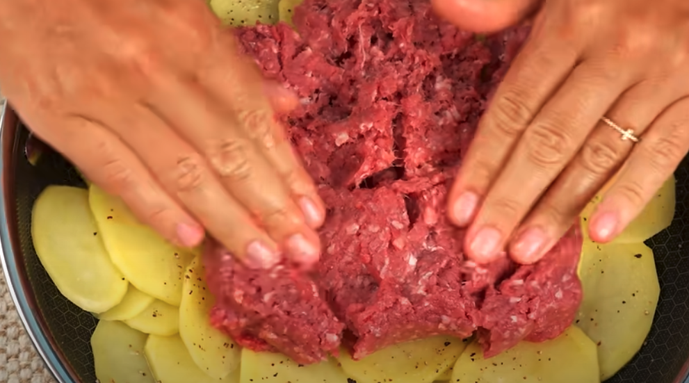 Obierz i pokrój 4 ziemniaki w cienkie plasterki. Nasmaruj żaroodporną patelnię o średnicy 25 cm olejem. Połóż połowę pokrojonych ziemniaków na dnie patelni. Dopraw ziemniaki solą i czarnym pieprzem. Ostrożnie rozłóż 450 g mięsa mielonego na ziemniakach. Dopraw mięso solą, czarnym pieprzem, 1/2 łyżeczki proszku czosnkowego i 1/2 łyżeczki słodkiej papryki. Pokrój 1/2 cebuli i połóż ją na mięsie mielonym.