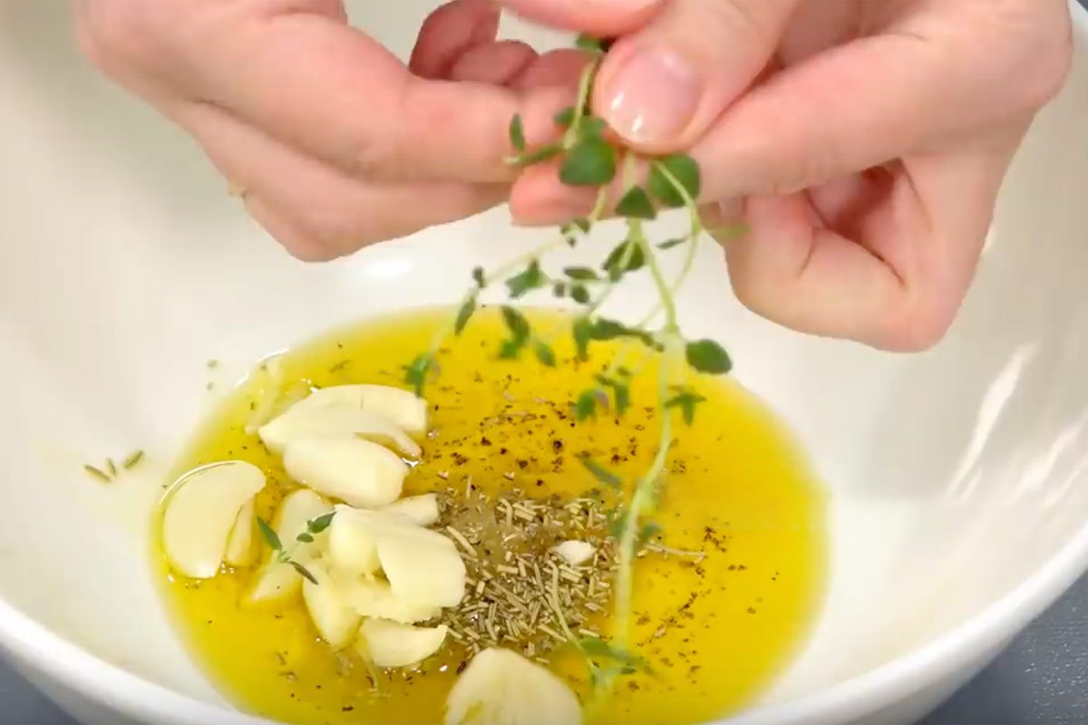 Połącz oliwę z oliwek, sól, pieprz i rozmaryn, przeciśnięte przez praskę ząbki czosnku i tymianek. Tak przygotowanym dressingiem polej ziemniaki.